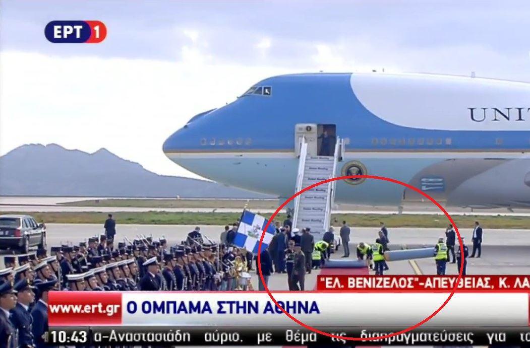 Όπως βλέπουμε και στο βίντεο, η θέση που σταμάτησε το Προεδρικό Αεροσκάφος των ΗΠΑ που μεταφέρει τον Μπαράκ Ομπάμα, δεν ήταν στην ευθεία που είχε τοποθετηθεί το κόκκινο χαλί στο οποίο θα περπατούσε ο Αμερικανός Πρόεδρος.