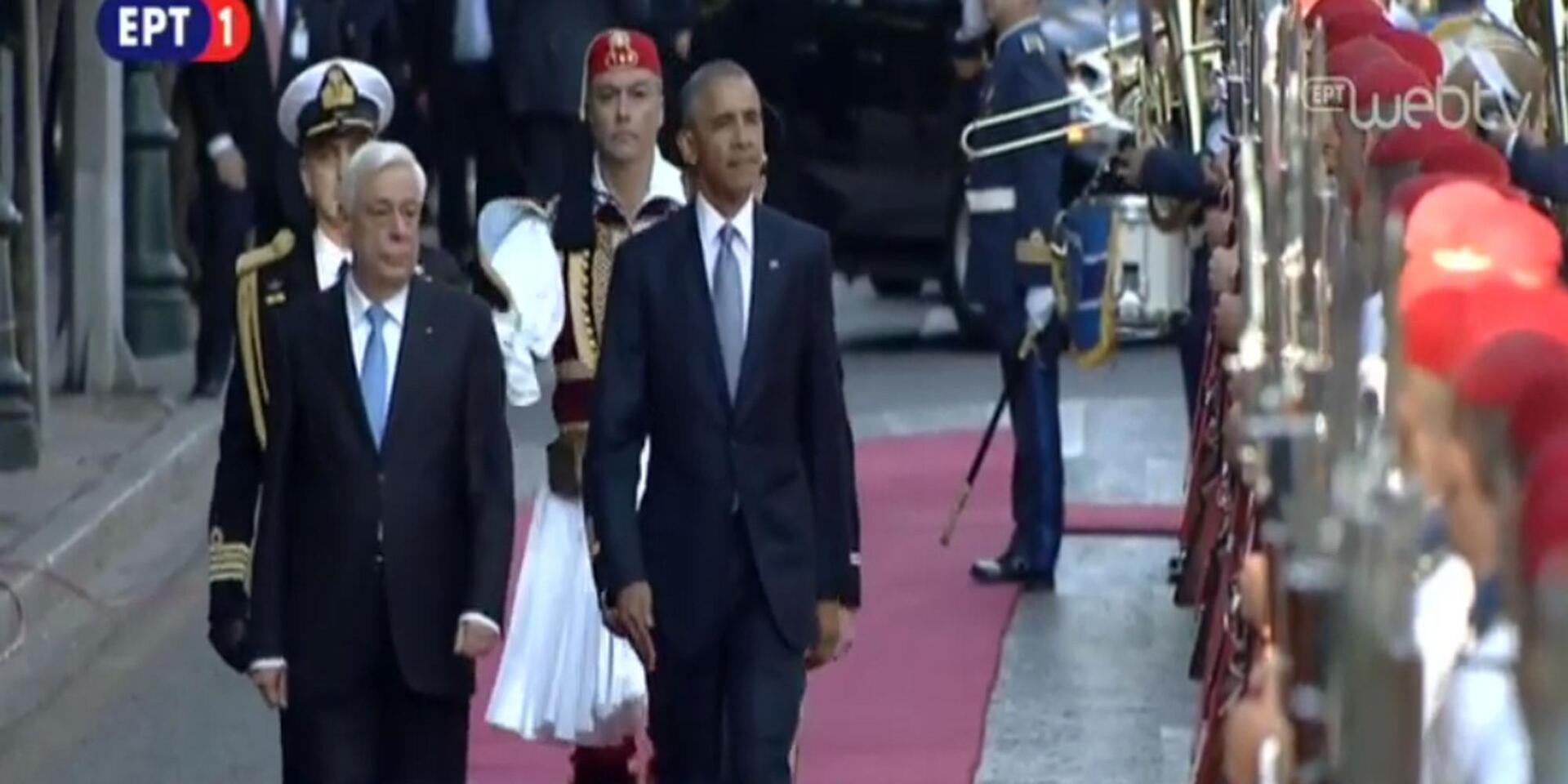 Tον Αμερικανό Πρόεδρο υποδέχθηκε ο ίδιος ο Πρόεδρος της Δημοκρατίας, Προκόπης Παυλόπουλος και ακολούθησε η απόδοση τιμών από την προεδρική φρουρά και η ανάκρουση των Εθνικών Ύμνων Ελλάδας και Ηνωμένων Πολιτειών.