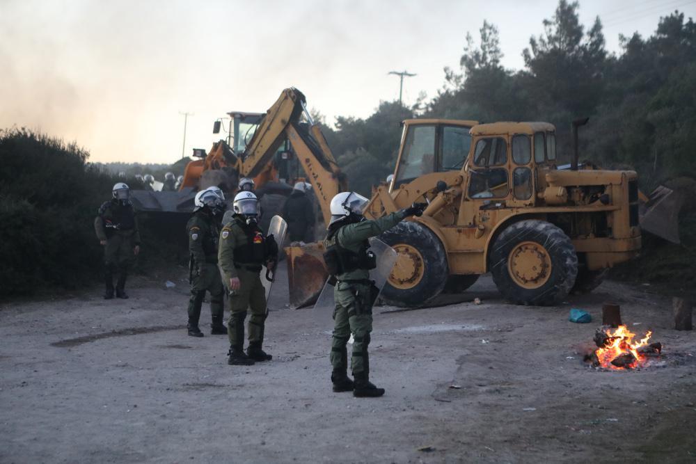Οι αστυνομικές δυνάμεις έκαναν χρήση χειροβομβίδων κρότου λάμψης και χημικών ενάντια στους συγκεντρωμένους που διαμαρτύρονται για την επίταξη και τη νέα κλειστή δομή που σχεδίαστηκε να κατασκευαστεί στη Λέσβο. Ας σημειωθεί ότι κατά την επίθεση με τα χημικά ξέσπασαν μικρές πυρκαγιές σε δασική έκταση, οι οποίες αντιμετωπίσθηκαν άμεσα.