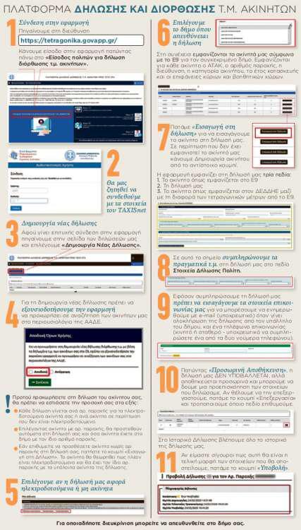 Ειδικότερα, κάθε ενδιαφερόμενος ιδιοκτήτης ακινήτου, θα μπορεί με τους κωδικούς που έχει για να αποκτά πρόσβαση στις υπηρεσίες του TAXISnet να εισέρχεται και στην συγκεκριμένη ηλεκτρονική πλατφόρμα και να δηλώνει υπεύθυνα στον οικείο Δήμο, συμπληρωματικά ή και αρχικά, το πραγματικό σημερινό εμβαδόν κάθε ιδιοκτησίας του που ηλεκτροδοτείται ή και που δεν ηλεκτροδοτείται, ή και δεν ηλεκτροδοτήθηκε ποτέ, τακτοποιημένο ή μη, το οποίο θα πρέπει να συμπίπτει με το εμβαδόν που είναι δηλωμένο στο Ε9, αλλά και τυχόν αλλαγή της χρήσης της ιδιοκτησίας σε άλλη από αυτή που ήταν δηλωμένη στο Δήμο.