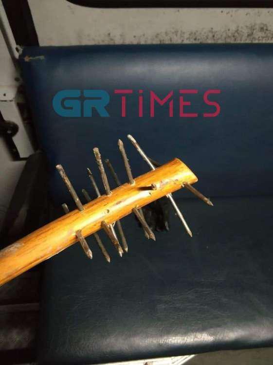 Επίσης φωτογραφίες εμφανίζουν ρόπαλα με… καρφιά να εκτοξεύονται εναντίον αστυνομικών, ενώ από τη ρίψη -πιθανότατα φωτοβολίδων- οι στολές ανδρών των ΜΑΤ πήραν φωτιά!