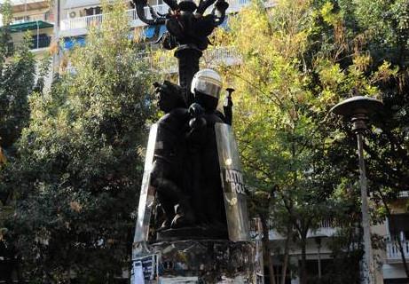 Ο εξοπλισμός των ΜΑΤ χρησιμοποιήθηκε για τον «στολισμό» της πλατείας Εξαρχείων, μια καθαρά συμβολική κίνηση από μέρους των νεαρών ταραξιών.