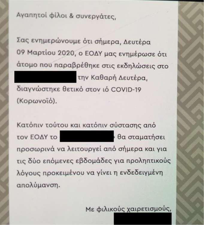 Έτσι η διοίκηση του κέντρου αποφάσισε να προχωρήσει σε προσωρινή αναστολή λειτουργίας από τη Δευτέρα 9 Μαρτίου και για δύο εβδομάδες ενώ θα γίνει και απολύμανση.