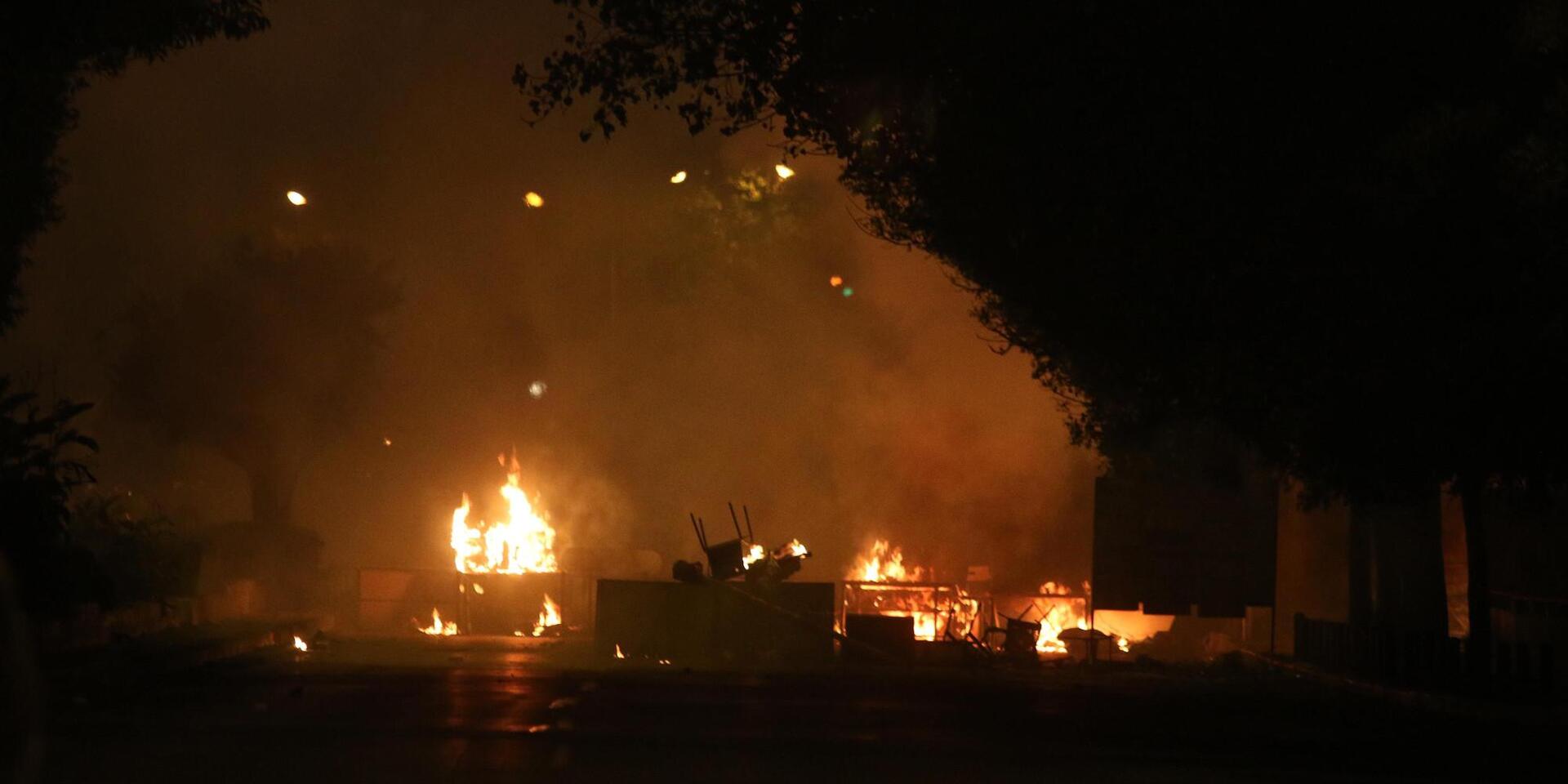 Από τις βόμβες μολότοφ ένα αυτοκίνητο παραδόθηκε στις φλόγες, ενώ έχουν μπει φωτιές σε πολλούς κάδους σκουπιδιών σε διάφορα σημεία.