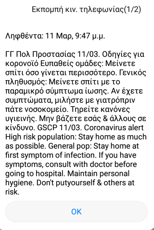 Υπενθυμίζεται ότι η χτεσινή ειδοποίηση για τον κορωνοϊό περιείχε γενικές οδηγίες προφύλαξης και μέτρων στα ελληνικά και αγγλικά. Συγκεκριμένα ανέφερε: «Οδηγίες για κορωνοϊό, ευπαθείς ομάδες: Μείνετε σπίτι όσο γίνεται περισσότερο. Γενικός πληθυσμός: Μείνετε σπίτι με το παραμικρό σύμπτωμα ίωσης. Αν έχετε συμπτώματα, μιλήστε με γιατρό πριν πάτε νοσοκομείο. Τηρείτε κανόνες υγιεινής. Μην βάζετε εσάς και τους άλλους σε κίνδυνο».
