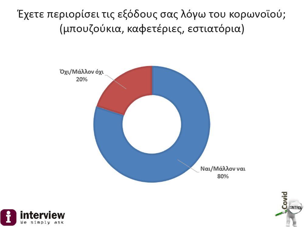 Ο περιορισμός των μετακινήσεων είναι μία πραγματικότητα για το 78% των ερωτώμενων (δεν περιόρισε τις μετακινήσεις του το 22%), ενώ το 80% μείωσε τις εξόδους του (εστιατόρια, καφετέριες κα), έναντι του 20% που δεν τις συρρίκνωσε.