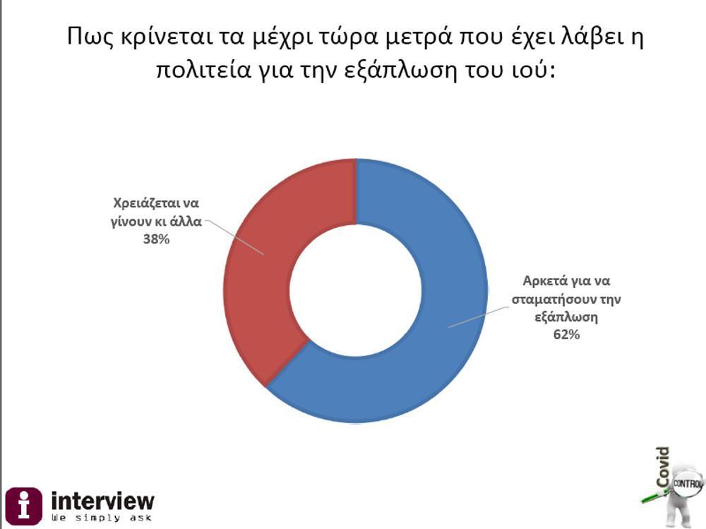 Για τα μέτρα που έχει λάβει η πολιτεία μέχρι στιγμής για την πανδημία το 62% απαντά πως είναι αρκετά για να σταματήσουν την εξάπλωση της και το 38% ότι χρειάζονται και άλλα.