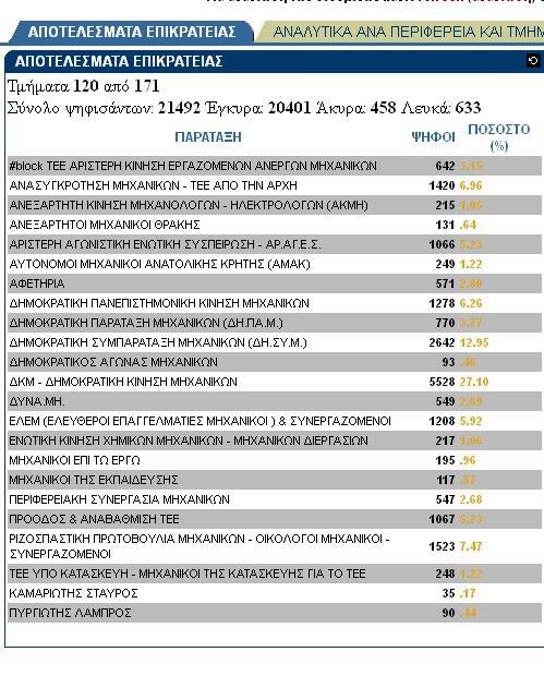 Στις σημερινές εκλογές μέχρι τώρα ψήφισαν 21.492 μηχανικοί και μετά την καταμέτρηση προέκυψαν 20.401 έγκυρα, 458 άκυρα και 653 λευκά ψηφοδέλτια.