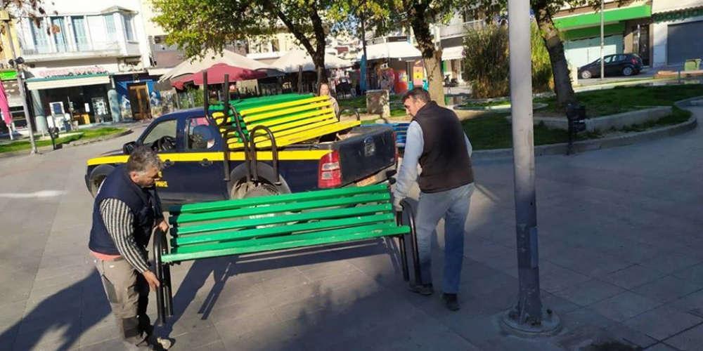 Με εντολή Δημάρχου, από το πρωί συνεργεία του Δήμου Κατερίνης απομακρύνουν όλα τα παγκάκια από τις πλατείες της πόλης.