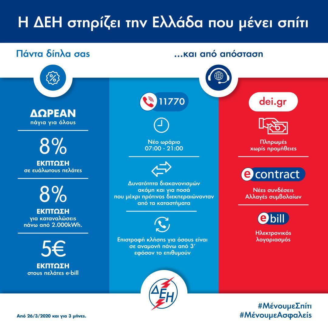 «Η ΔΕΗ στέκεται δίπλα στην ελληνική κοινωνία τις δύσκολες ώρες που περνάμε. Βασική της προτεραιότητα είναι η διασφάλιση της ενεργειακής επάρκειας της χώρας και συγχρόνως η στήριξη των καταναλωτών της. Ειδικά αυτή την κρίσιμη περίοδο, που επιβάλλεται η μεγαλύτερη δυνατή παραμονή μας στο σπίτι. Στο βαθμό των δυνατοτήτων της, προχωρά σε μια σειρά μέτρων οικονομικής ελάφρυνσης των πολιτών. Ενώ παράλληλα, βοηθά όλους τους πελάτες της να πραγματοποιήσουν τις συναλλαγές τους και να εξυπηρετηθούν από το σπίτι τους καλώντας στο τηλεφωνικό κέντρο της ΔΕΗ 11770 ή μέσα από την ιστοσελίδα www.dei.gr», αναφέρει η επιχείρηση.
