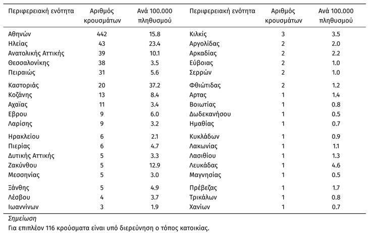 Σύμφωνα με τα στοιχεία του ΕΟΔΥ, στην Αθήνα τα κρούσματα ανέρχονται σε 442. Ακολουθούν η Ηλεία με 43, η Ανατολική Αττική με 39, η Θεσσαλονίκη με 38.