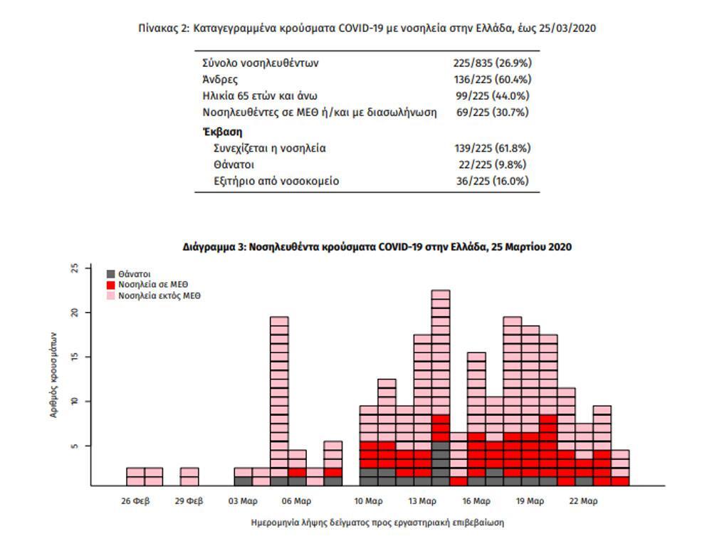 Κρούσματα COVID-19 με νοσηλεία: Έχουν καταγραφεί 225 (26.9%) κρούσματα με νοσηλεία σε νοσοκομείο, εκ των οποίων 69 (30.7%) διασωληνώθηκαν, και 22 (9.8%) έχουν καταλήξει (σ.σ. με βάση τα στοιχεία που έχουν δηλωθεί στον ΕΟΔΥ και καταγραφεί μέχρι τις 25 Μαρτίου 2020 και ώρα 19:00).