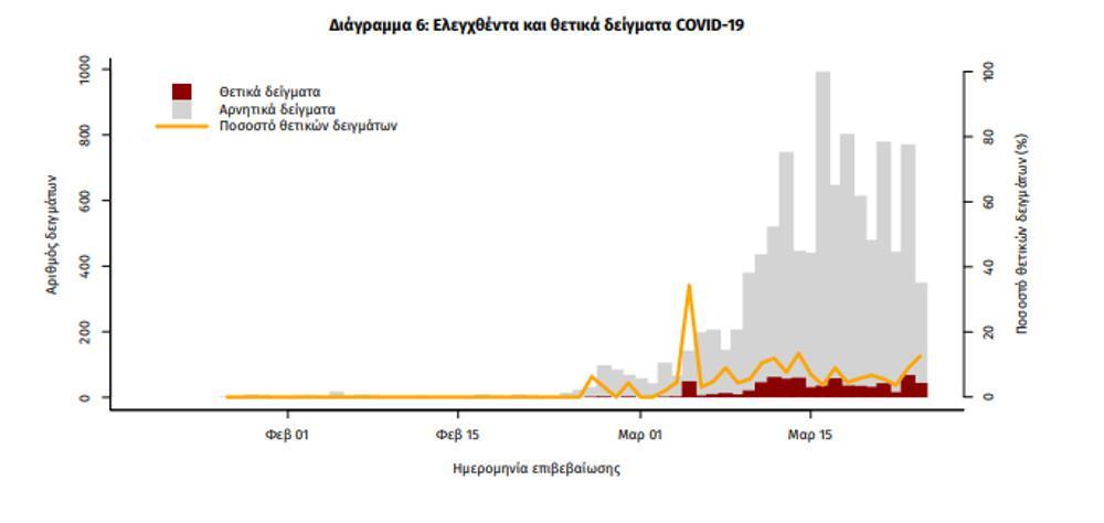 Δείγματα που έχουν ελεγχθεί εργαστηριακά: Από την 1η Ιανουαρίου 2020 μέχρι σήμερα, στα εργαστήρια που διενεργούν εξετάσεις για τον νέο κορωνοϊό και που δηλώνουν συστηματικά στον ΕΟΔΥ το σύνολο των δειγμάτων που ελέγχουν (θετικά και αρνητικά), έχουν συνολικά ελεγχθεί 10495 κλινικά δείγματα, εκ των οποίων τα 745 (7.1%) θετικά στον κορωνοϊό.