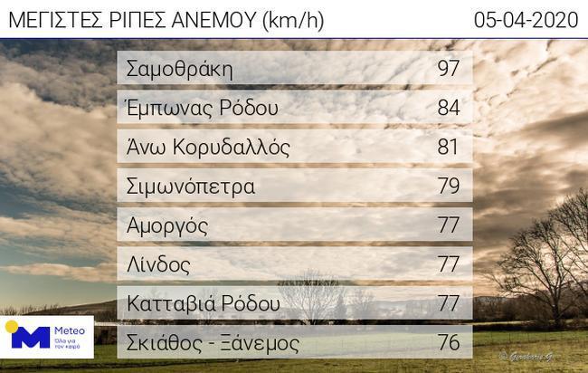 Παράλληλα, θυελλώδεις άνεμοι πνέουν στο Βόρειο Αιγαίο από τις πρώτες πρωινές ώρες σήμερα, με τις ριπές των ανέμων να ξεπερνούν τα 90 χιλιόμετρα την ώρα. Οι μεγαλύτερες ριπές έχουν καταγραφεί από το Αστεροσκοπείο στη Σαμοθράκη (97 χλμ/ώρα) και στον Έμπωνα Ρόδου (84 χλμ/ώρα).