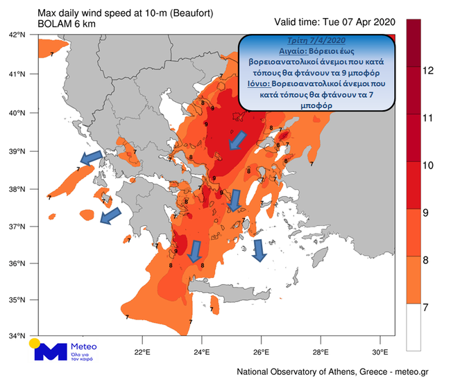 Οι άνεμοι στο Αιγαίο θα πνέουν από βόρειες έως βορειοανατολικές διευθύνσεις 6 έως 8 και τοπικά έως 9 μποφόρ, ενώ στο Ιόνιο από βορειοανατολικές διευθύνσεις με ένταση 4 έως 6 και πρόσκαιρα κατά τόπους έως 7 μποφόρ. Σταδιακή εξασθένηση των ανέμων αναμένεται αύριο, Τετάρτη 8 Απριλίου.