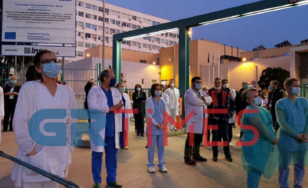 Ανάβοντας τους φάρους και στέλνοντας το δικό τους μήνυμα από τα μεγάφωνα των οχημάτων που είχαν παραταχθεί έξω από το νοσοκομείο, οι πυροσβέστες είπαν ένα «μεγάλο ευχαριστώ» για την προσφορά του προσωπικού του νοσοκομείου.
