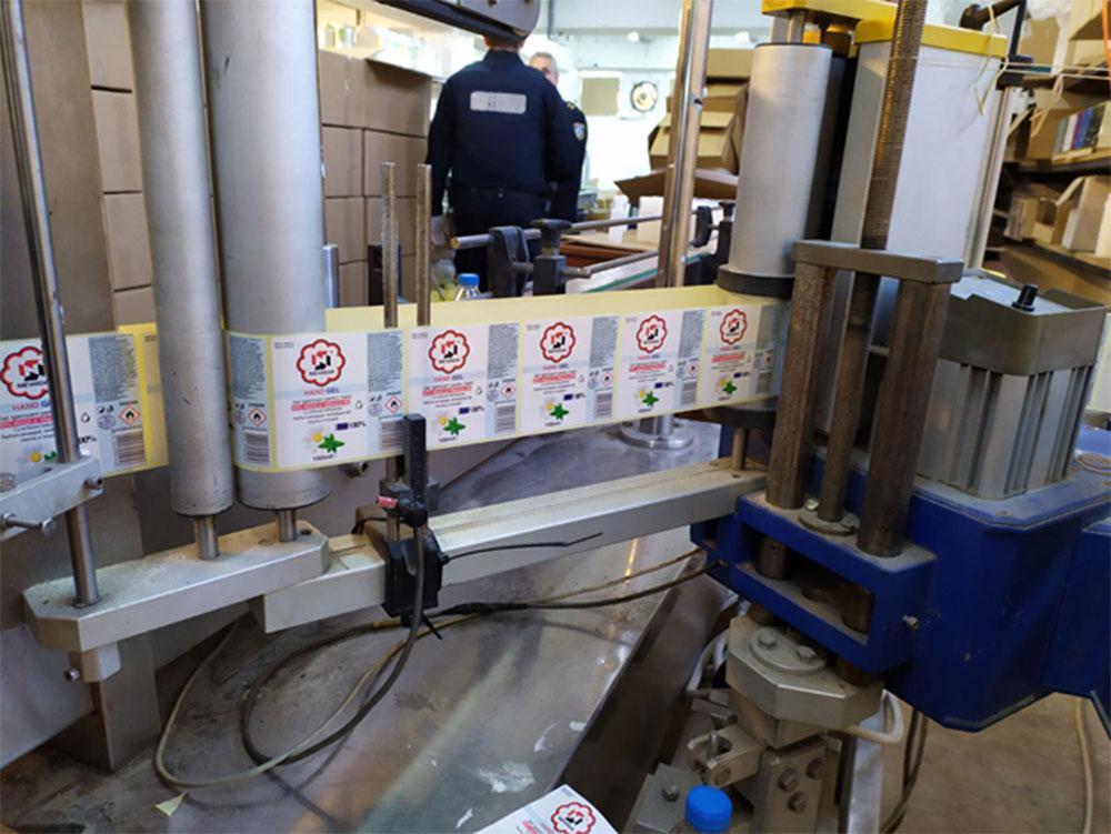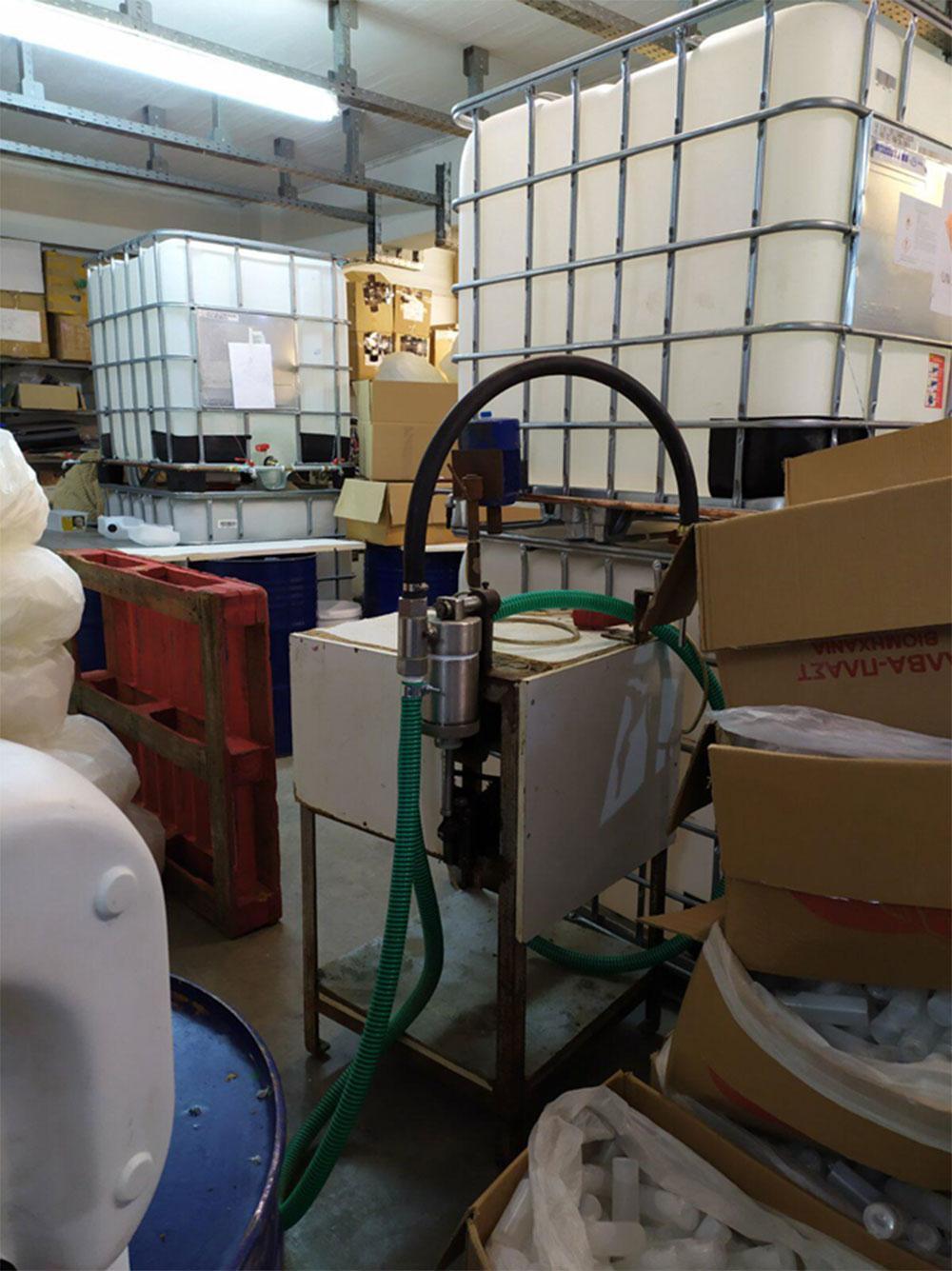 Στα πλαίσια αναζήτησης των εταιρειών που εμπλέκονταν στη συγκεκριμένη συναλλαγή, το κλιμάκιο ελέγχου εντόπισε παράνομο χώρο παραγωγής και συσκευασίας των ανωτέρω αντισηπτικών και καλλυντικών διαλυμάτων στην περιοχή του Μενιδίου.