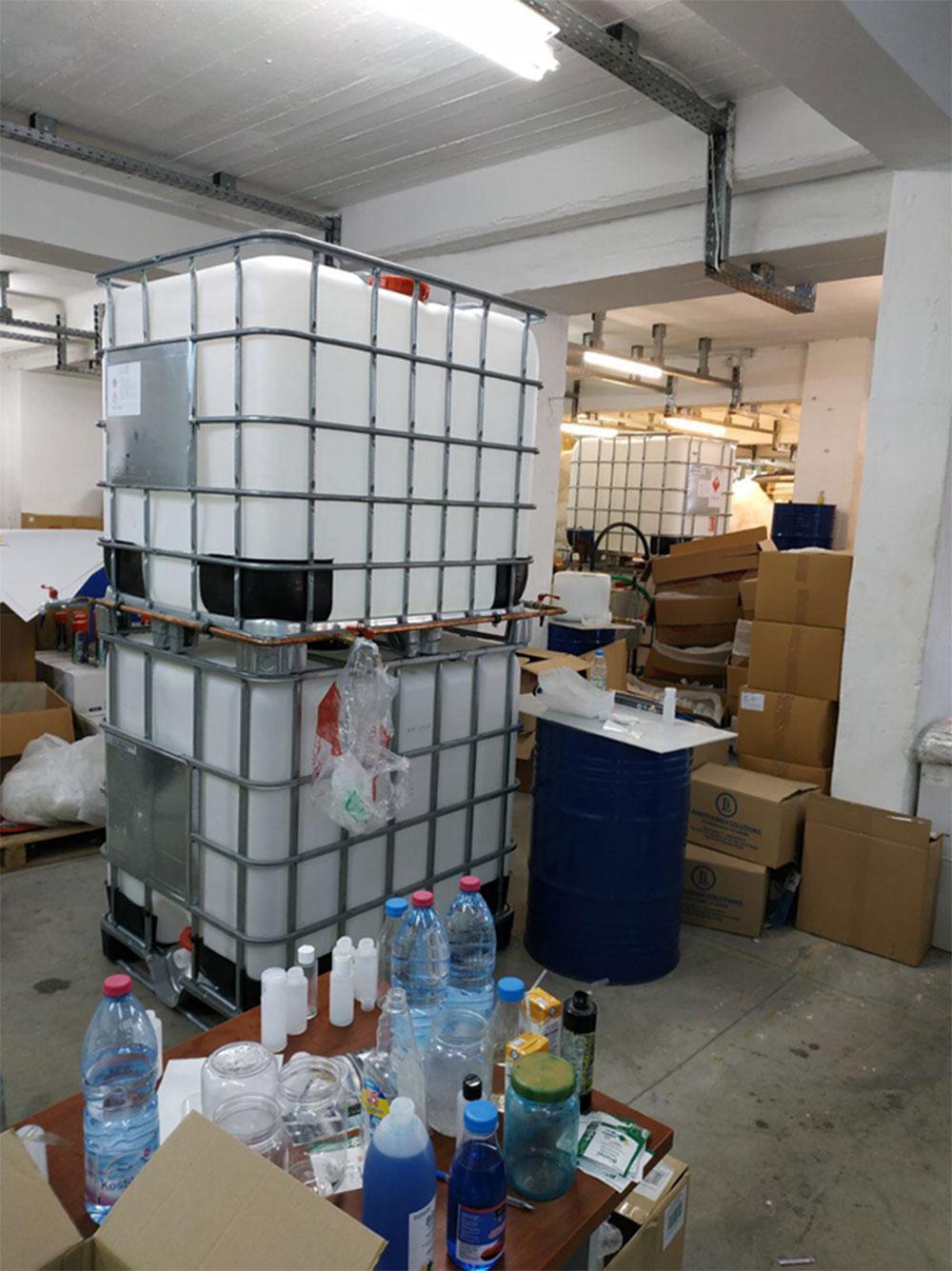 Περίπου 40.000 φιάλες αντισηπτικών υγρών των 100ml, που αντιστοιχούν σε 4.000 λίτρα διαλύματος, 54.000 κενές φιάλες και 248.000 ετικέτες συσκευασίας, 11 κενές δεξαμενές των 1.000 λίτρων με ένδειξη «ισοπροπυλική αιθανόλη» που χρησιμοποιούνταν ως πρώτη ύλη για την παρασκευή των αντισηπτικών υγρών, καθώς επίσης και λοιπός βιοτεχνικός εξοπλισμός.
