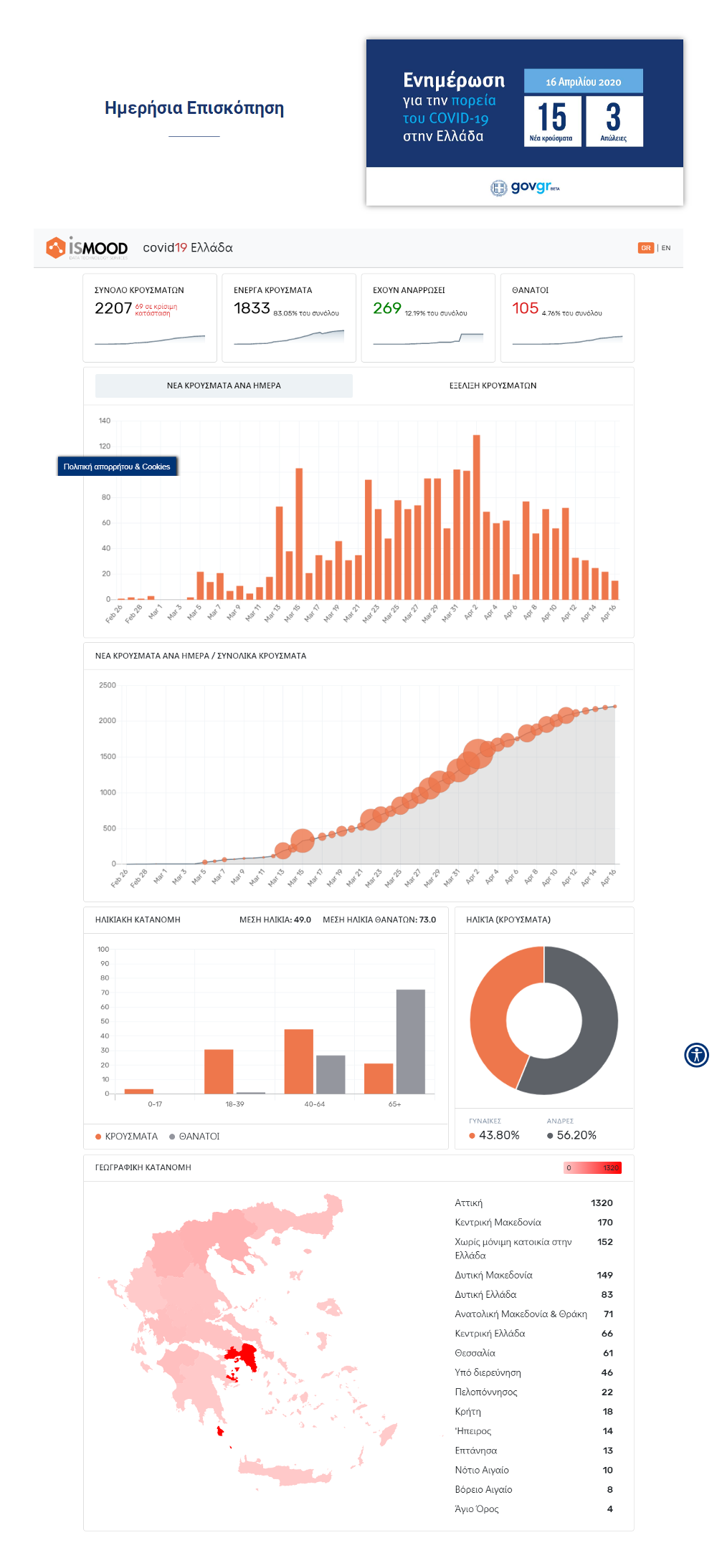 Τα στοιχεία που παρουσιάζονται αφορούν περιστατικά από την επιδημιολογική επιτήρηση της νόσου από το νέο κορωνοϊό (COVID19), με βάση τα δεδομένα που έχουν δηλωθεί στον ΕΟΔΥ και καταγραφεί μέχρι τις 16 Απριλίου 2020 (ώρα 15:00).