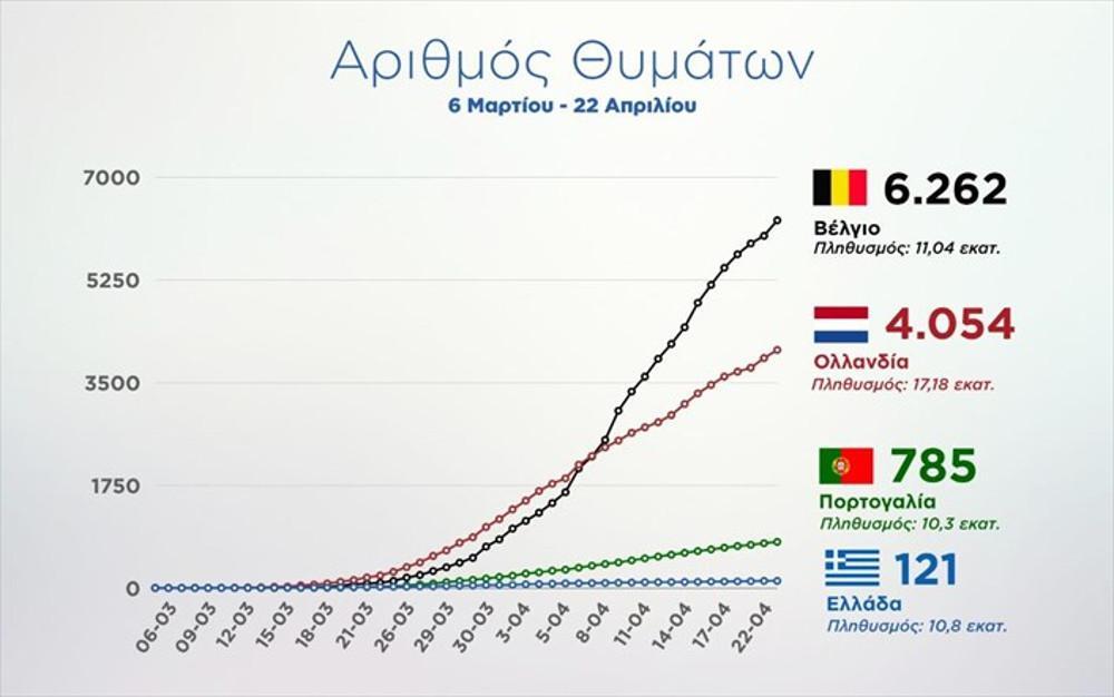 Και σε επίπεδο θυμάτων, την περίοδο 6 Μαρτίου-22 Απριλίου, η Ελλάδα είχε 121 νεκρούς, η Πορτογαλία 785, η Ολλανδία 4.054 και το Βέλγιο 6.262 απώλειες.
