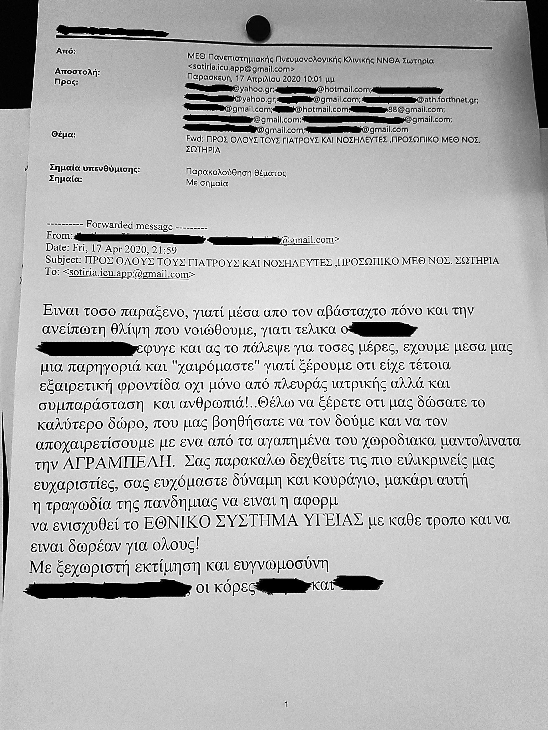 Οι υπόλοιποι έξι ασθενείς στην Πανεπιστημιακή ΜΕΘ του «Σωτηρία» είναι ως επί το πλείστον διασωληνωμένοι. Αλλά έτσι κι αλλιώς οι αποστάσεις στα κρεβάτια τους είναι μεγάλες και δεν μπορούν να επικοινωνήσουν. Η κ. Αθανασία, όποτε θέλει μια ανθρώπινη επαφή, συνομιλεί με τους γιατρούς και τους νοσηλευτές, οι οποίοι, υπομονετικά και με χαμόγελο, αντεπεξέρχονται στην πρωτόγνωρη κατάσταση, με συνεχή τον φόβο να κολλήσουν και οι ίδιοι. «Η φροντίδα που μου παρέχουν είναι εξαιρετική. Είμαι πάρα πολύ τυχερή που έχω τέτοιους γιατρούς δίπλα μου», λέει η κ. Δραπανιώτου.
