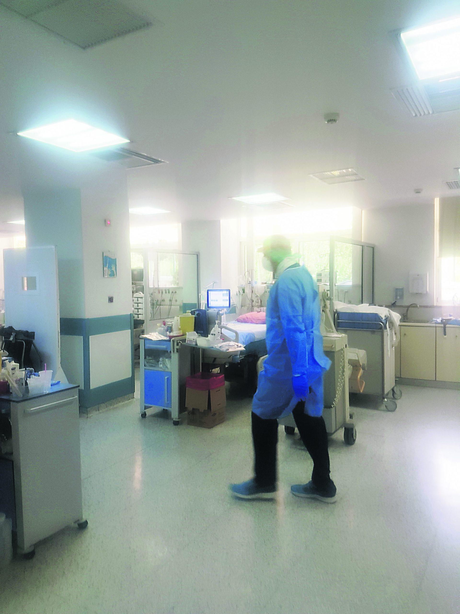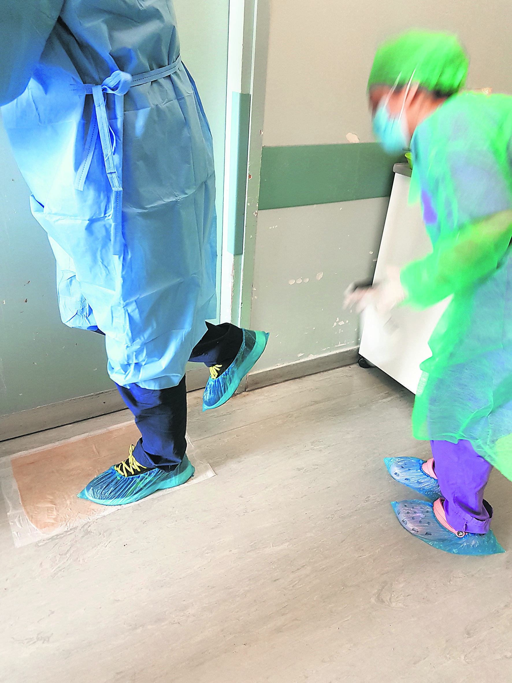 Η έξοδος από την πόρτα της ΜΕΘ προϋποθέτει απολύμανση των κάτω άκρων έτσι ώστε το περπάτημα στον χώρο εκτός Εντατικής να γίνεται με ασφάλεια. Το ίδιο ακριβώς ισχύει και για τους χώρους των θαλάμων νοσηλείας. Για τον λόγο αυτό, έξω από τις κλειστές πόρτες είναι ένας γιατρός που βοηθά αυτούς που είναι μέσα να απολυμανθούν και να βγουν «καθαροί».