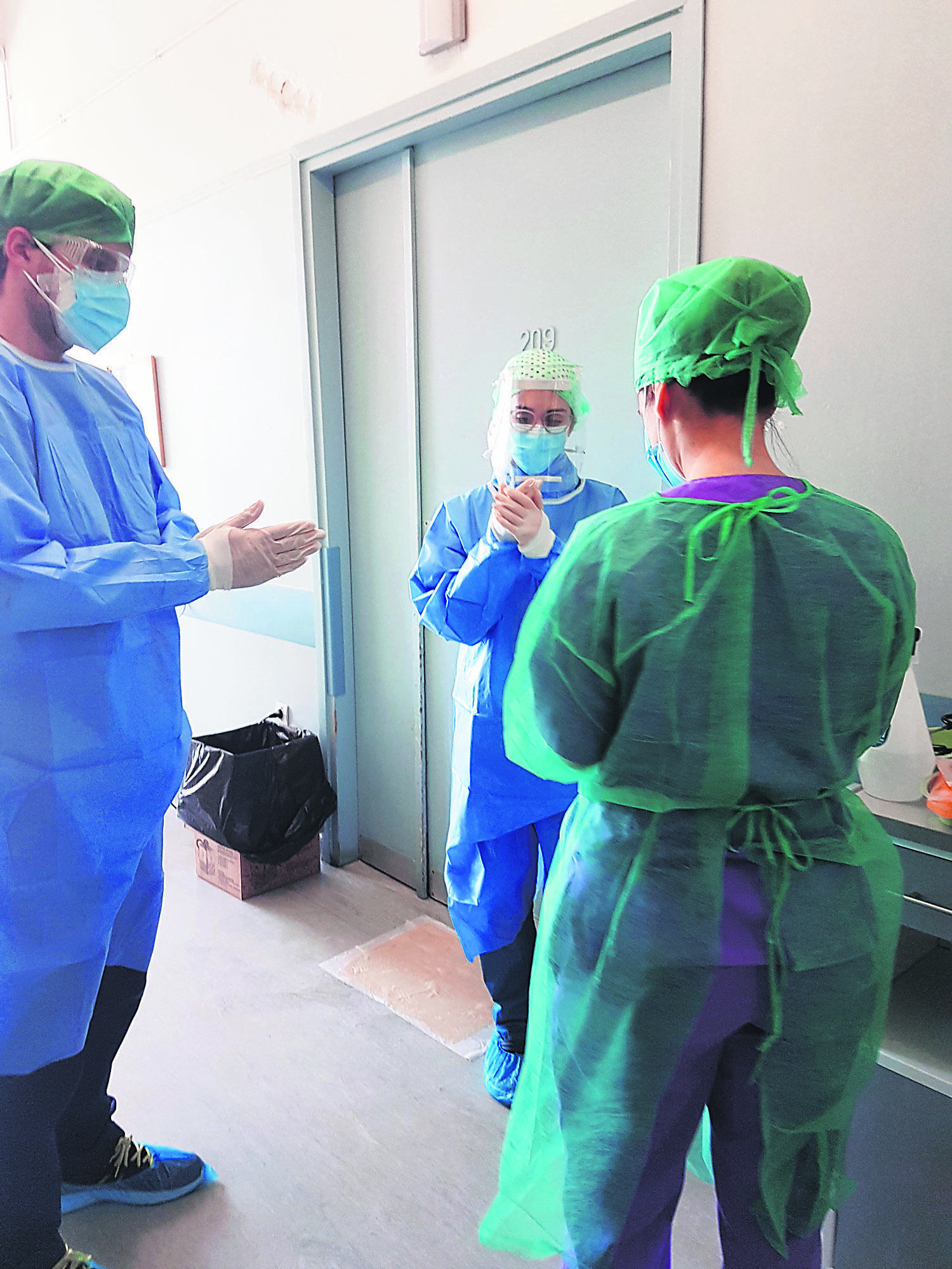 Η 29χρονη Ελένη, ειδικευόμενη γιατρός στην Παθολογία, με απώτερο σκοπό να γίνει ρευματολόγος, κάνει ακριβώς αυτή τη δουλειά. Βρίσκεται έξω από τους θαλάμους απλής νοσηλείας όσο οι γιατροί πραγματοποιούν τακτική επίσκεψη στους ασθενείς. «Μου χτυπάνε την πόρτα, ανοίγω, παίρνω αντικείμενα, για παράδειγμα αιμοληψίες, από μέσα και τα τοποθετώ σε ειδικά σακουλάκια. Στη συνέχεια βοηθώ τους γιατρούς να αφαιρέσουν τα γάντια τους, να απολυμάνουν τα πόδια τους. Εάν δεν γίνει όλη αυτή η διαδικασία, τότε είναι πολύ επικίνδυνο», αναφέρει στον «Ε.Τ.», προσθέτοντας ότι αυτό που της έχει προκαλέσει έκπληξη, στη μοναδική εμπειρία που ζει ως νέα στον χώρο των νοσοκομείων, είναι το πόσο γρήγορα παρουσιάζει αναπνευστική ανεπάρκεια ένας ασθενής και καταλήγει να διασωληνωθεί, αλλά και πόσο γρήγορα ανακάμπτει εάν καταφέρει να αποσωληνωθεί. «Εάν τον αποσωληνώσουμε, ξέρουμε ότι τον σώσαμε», αναφέρει η ειδικευόμενη γιατρός.