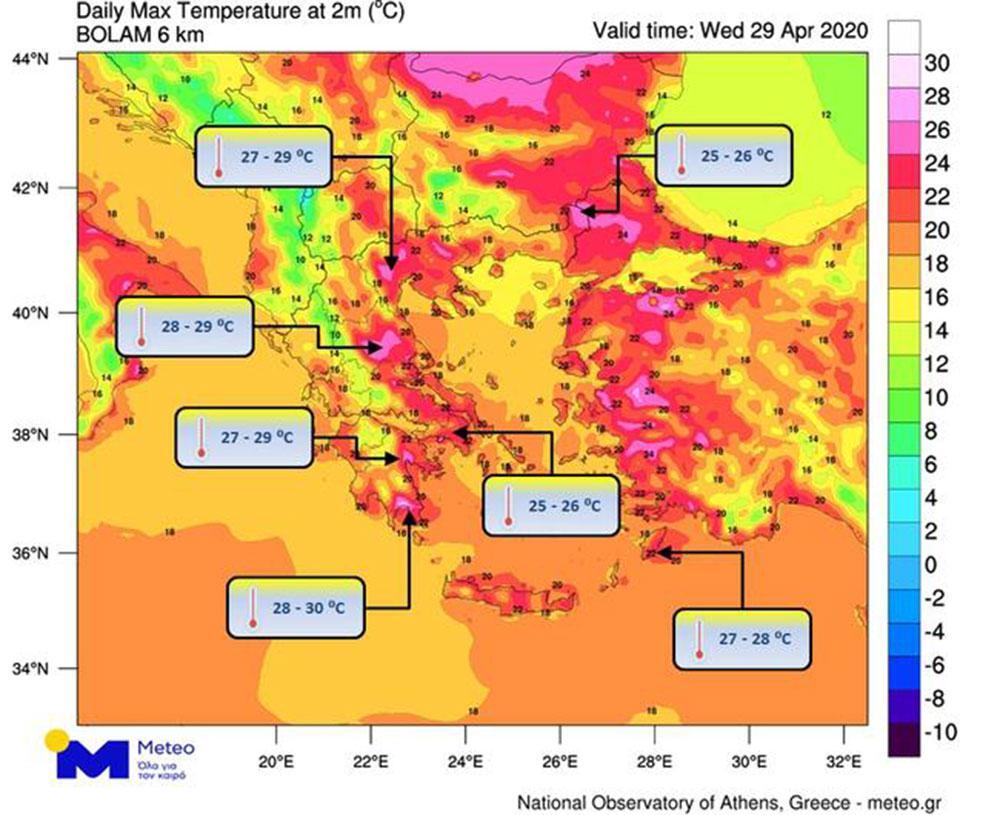 Ακολουθεί χάρτης στον οποίο καταγράφονται οι μέγιστες θερμοκρασίες που θα επικρατήσουν την Τετάρτη 29/04 ενώ επισημαίνονται ενδεικτικές τιμές σε διάφορες περιοχές της χώρας: