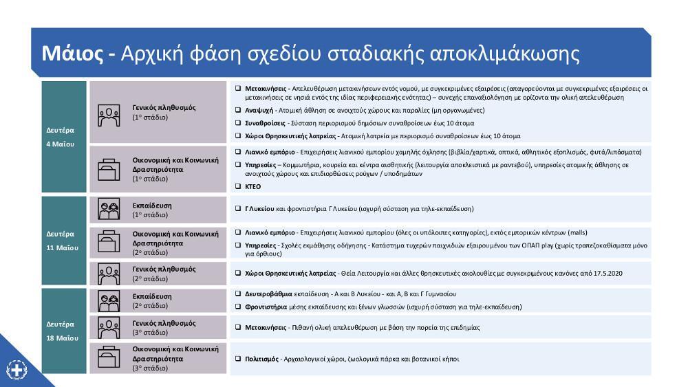 Στο πρώτο στάδιο που τοποθετείται στις 4 Μαΐου επανεκκινούν οι εταιρείες λιανικού εμπορίου (βιβλιοπωλεία οπτικά, αθλητικός εξοπλισμός, πώλησης φυτών, αγορές καταναλωτών και απελευθερώνεται η μετακίνηση παραγωγών για τις λαϊκές αγορές μεταξύ περιφερειών) και παροχής υπηρεσιών (κομμωτήρια, κουρεία κέντρα αισθητικής και ΚΤΕΟ).