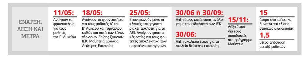 Τέλος, στα σχολεία Δεύτερης Ευκαιρίας θα εκκινήσουν μόνο για τους μαθητές του Β’ κύκλου που αποφοιτούν φέτος και η λήξη του σχολικού έτους ορίζεται για τις 30 Ιουνίου. Δεν προβλέπεται να ανοίξουν τα ειδικά σχολεία αλλά και οι βιβλιοθήκες.