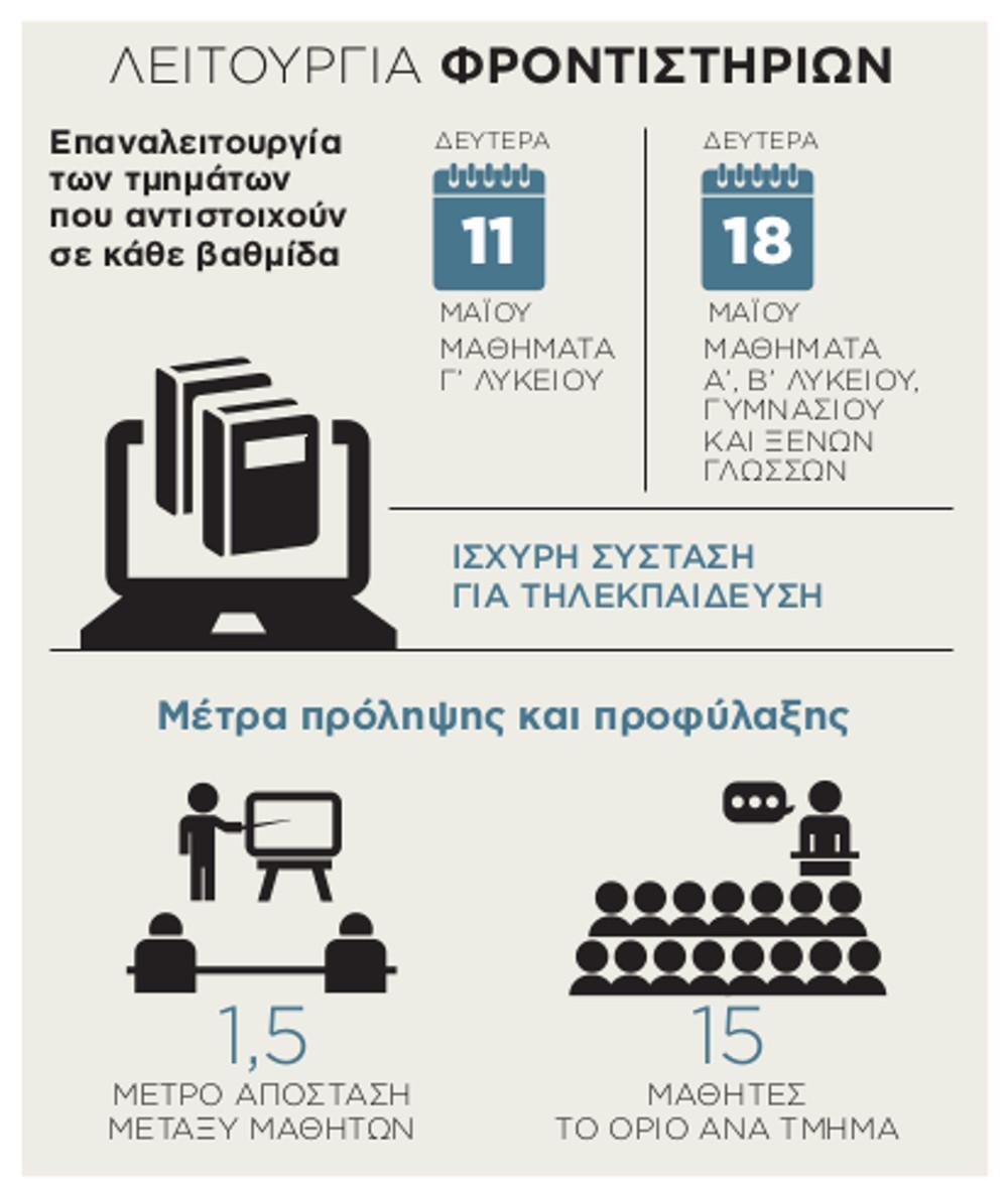 Σε περίπτωση που οι μαθητές ξαναμπούν στις τάξεις, θα πρέπει να τηρείται το 1,5 μέτρο απόστασης αλλά και το όριο των 15 μαθητών ανά τμήμα. Τα παραπάνω μέτρα θα ισχύσουν και για τις υπόλοιπες δομές εκπαίδευσης που θα ανοίξουν σταδιακά τις επόμενες μέρες.