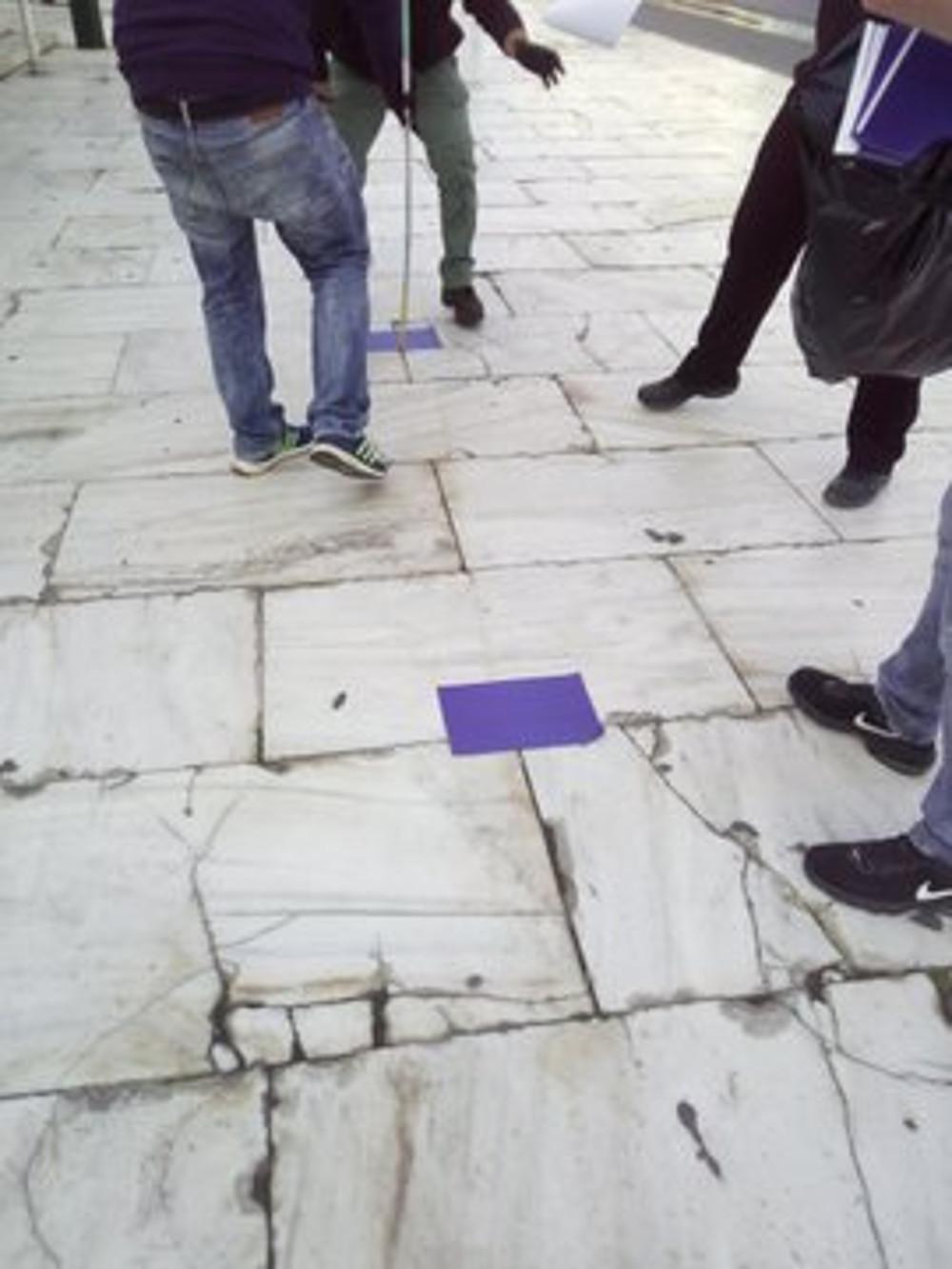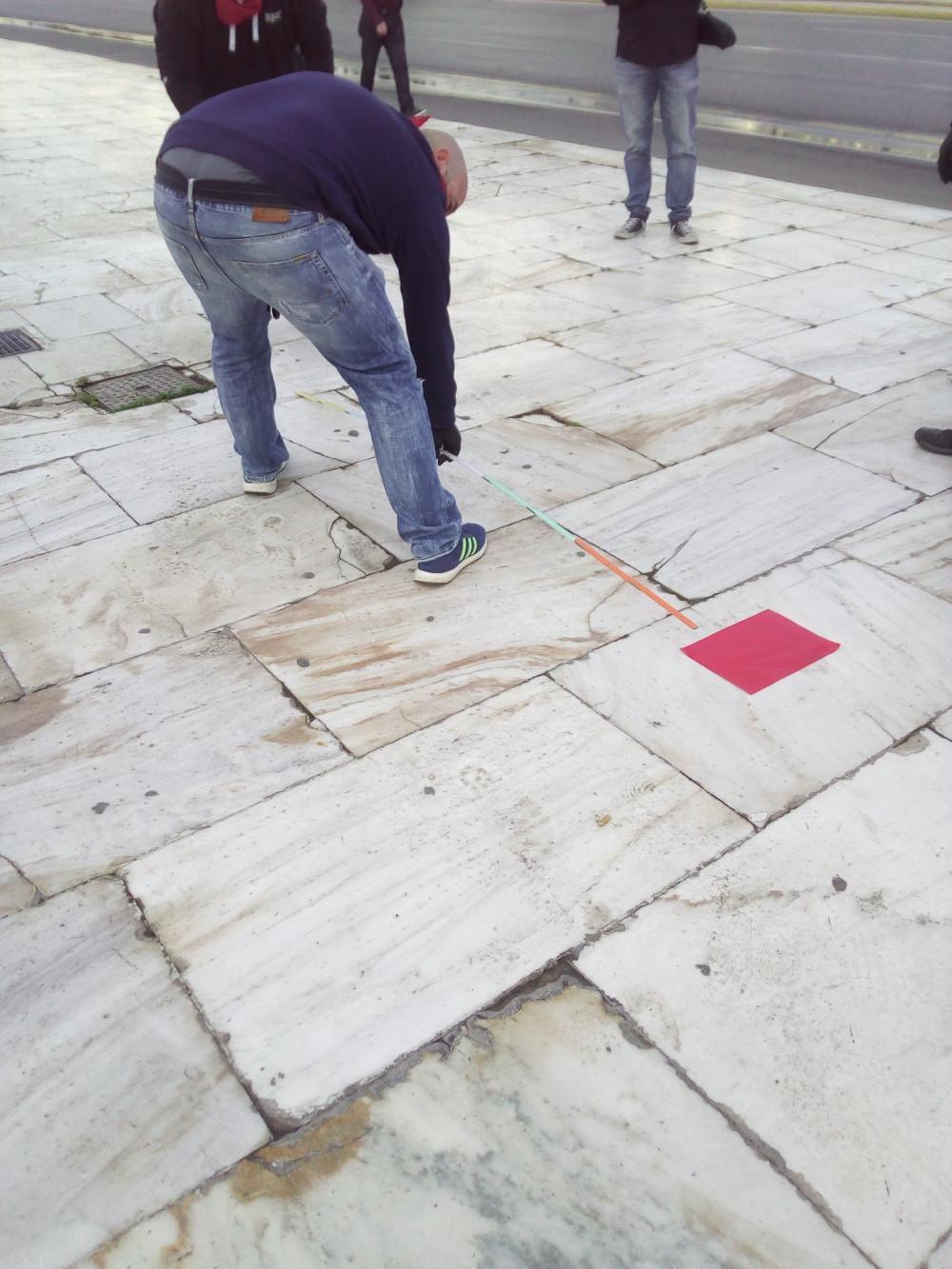 Τα μέλη του ΠΑΜΕ επιστράτευσαν μέχρι και μεζούρες για να τοποθετήσουν αυτοκόλλητα στο οδόστρωμα προκειμένου να τηρηθούν οι αποστάσεις μεταξύ των διαδηλωτών στη συγκέντρωση που πραγματοποιεί στην πλατεία Συντάγματος για την εργατική Πρωτομαγιά.
