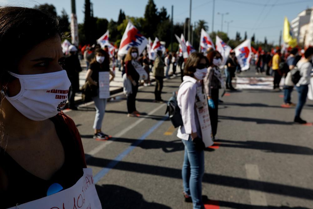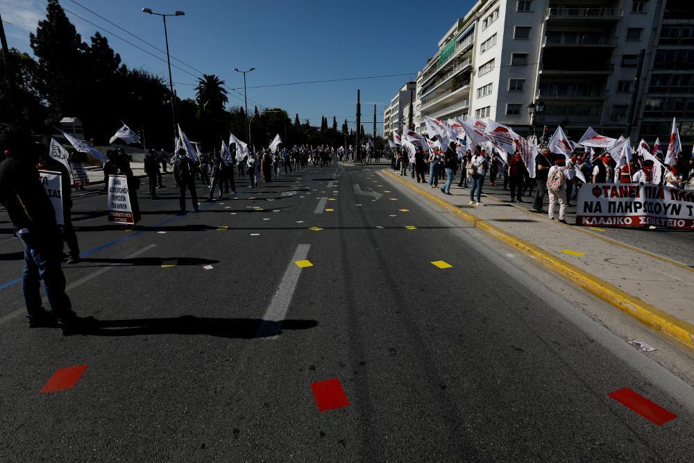 Οι διαδηλωτές που είχαν συγκεντρωθεί στο Σύνταγμα φορώντας μάσκες και γάντια στέκονται στα συγκεκριμένα σημάδια που έχουν τοποθετηθεί τόσο στο οδόστρωμα όσο και στο πεζοδρόμιο.