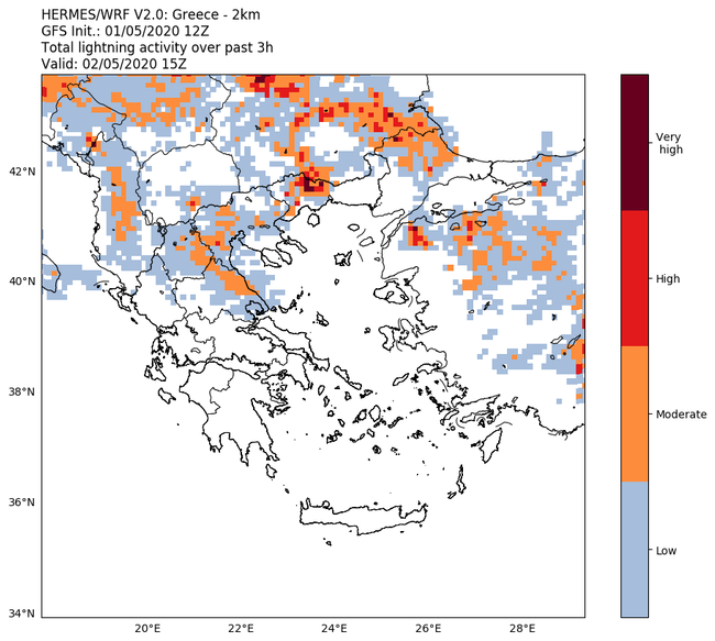 Σύμφωνα με τα προγνωστικά στοιχεία του συστήματος πρόγνωσης κεραυνών TALOS, οι καταιγίδες που θα εκδηλωθούν σήμερα στη Θεσσαλία και ιδιαίτερα στη Βόρεια Ελλάδα, θα συνοδεύονται από έντονη κεραυνική δραστηριότητα, ιδίως τις απογευματινές ώρες.