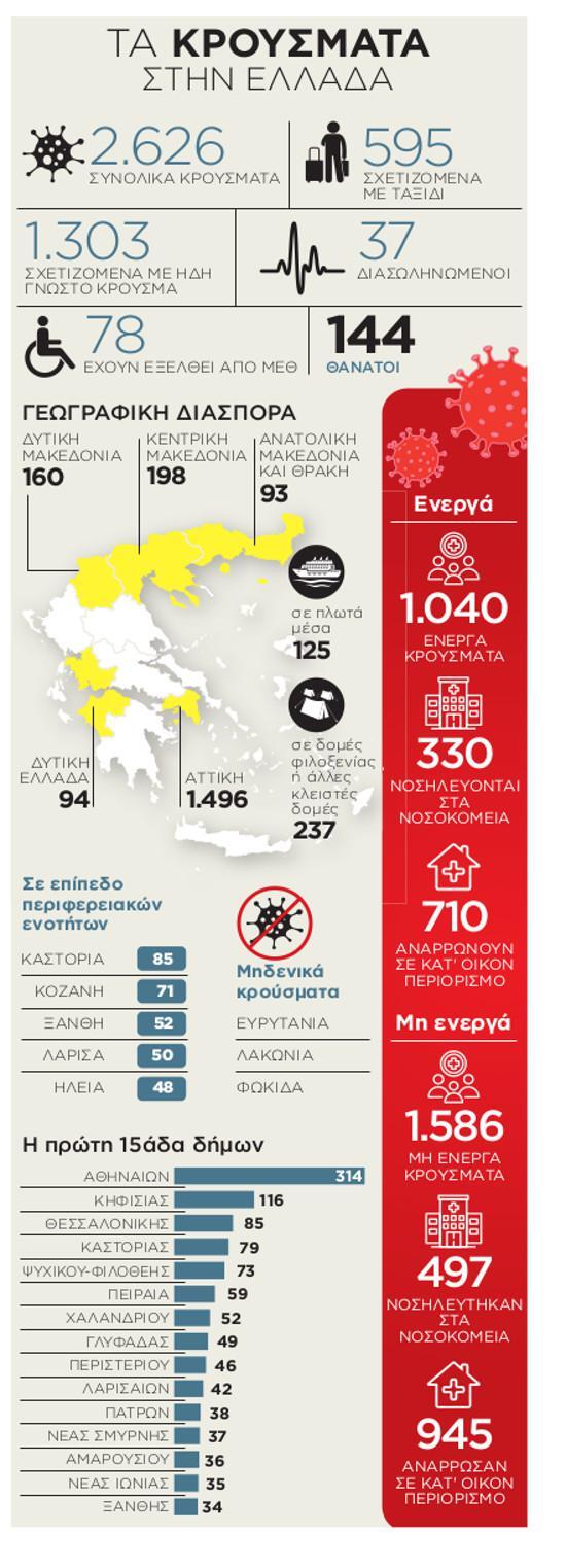 Εν τω μεταξύ, στο δρόμο είναι από σήμερα οι κινητές ομάδες του ΕΟΔΥ, που θα πραγματοποιούν δειγματοληπτικά τεστ στον πληθυσμό, στο πλαίσιο μαζικότερου εργαστηριακού ελέγχου που εντείνεται από σήμερα. Και, καθώς οι απαγορεύσεις αίρονται, η αύξηση του αριθμού των τεστ θα δίνει μια εικόνα του αριθμού των κρουσμάτων, συνεπώς καλύτερη διαχείριση της επιδημίας.