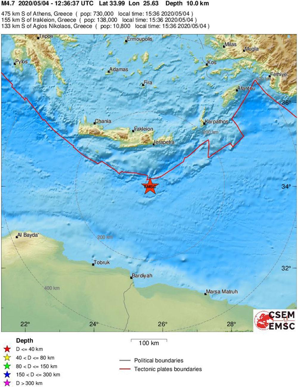 Η δόνηση είχε εστιακό βάθος 20,8 χλμ και επίκεντρο που εντοπίζεται στα 99 χλμ νότια της Ιεράπετρας.