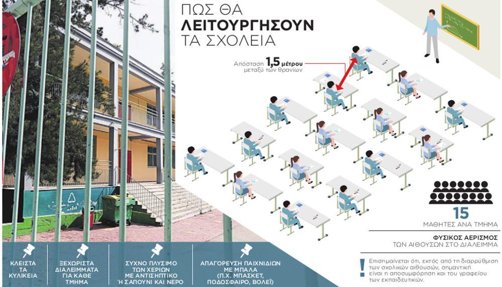Η επιστροφή των μαθητών στις σχολικές μονάδες γίνεται υπό αυστηρά μέτρα, τα οποία δεν επιτρέπουν συνωστισμό και υπαγορεύουν τήρηση των οδηγιών υγιεινής των χεριών. Οι τάξεις θα αναμορφωθούν, το προαύλιο θα «χωριστεί» σε μέρη ώστε να μην έρχονται όλοι οι μαθητές σε επαφή, ενώ ακόμα και την ώρα του παιχνιδιού θα μπουν αυστηροί όροι.