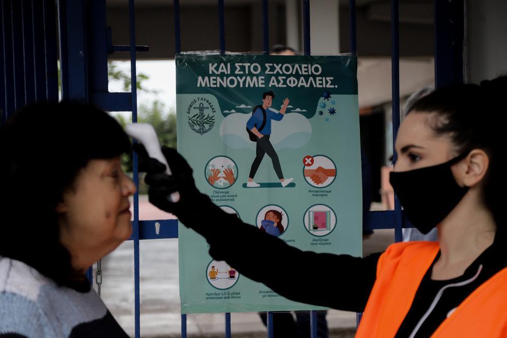 Χαρακτηριστικές είναι οι εικόνες από το Α Γυμνάσιο-Λύκειο Γλυφάδας, όπου κάθε μαθητής και εκπαιδευτικός πρέπει να θερμομετρηθεί προτού εισέλθει στο κτίριο και εν συνεχεία να περάσει μπροστά από την θερμική κάμερα που έχει τοποθετηθεί στο κατώφλι του σχολείου.