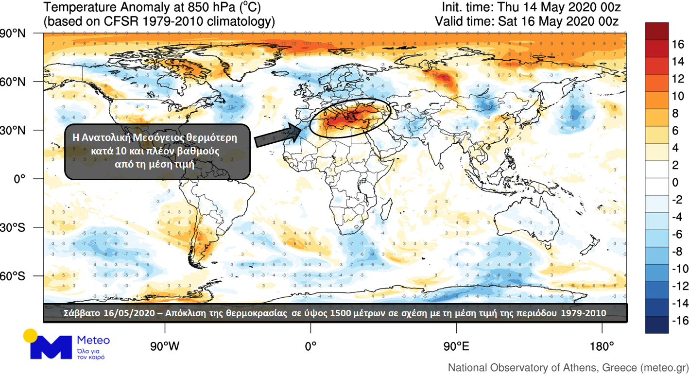 Στη χώρα μας, η αναμενόμενη απόκλιση από τη μέση τιμή της θερμοκρασίας γι’ αυτήν την εποχή θα ξεπεράσει τους δέκα βαθμούς Κελσίου και θα είναι η μεγαλύτερη που θα καταγραφεί σε όλον τον πλανήτη τις επόμενες ημέρες.