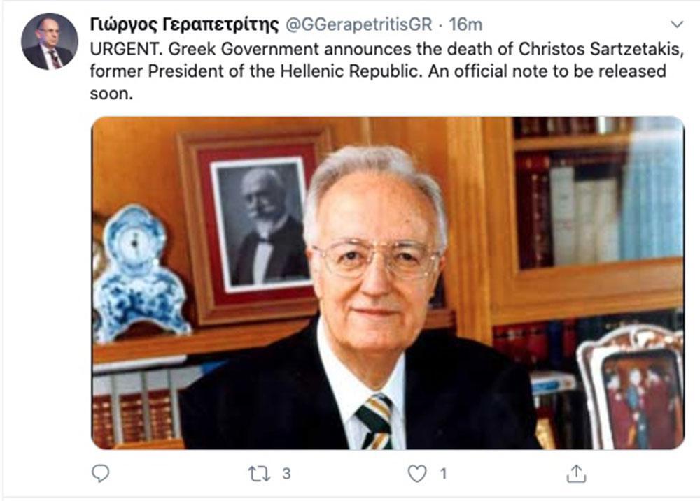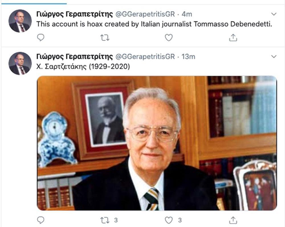 Συγκεκριμένα, τα ξημερώματα της Δευτέρας, δημιούργησε έναν λογαριασμό στο Twitter με το όνομα του υπουργού Επικρατείας, Γιώργου Γεραπετρίτη, και το μεσημέρι ανήρτησε την είδηση πως έφυγε από τη ζωή ο κ. Σαρτζετάκης.