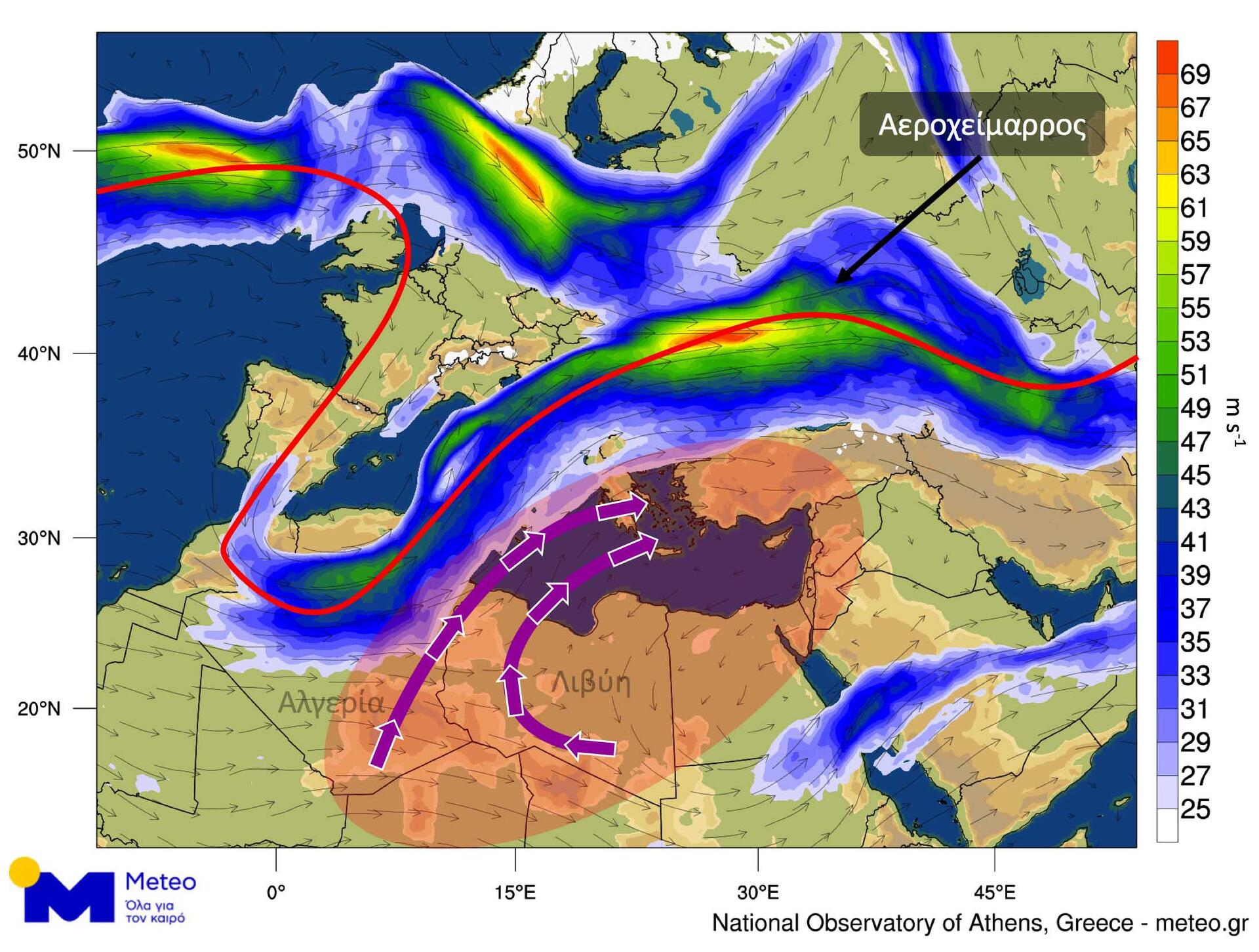 Πιο σπάνια όμως, όπως φέτος, οι ψυχρές αέριες μάζες από τη Βόρεια Ευρώπη μετακινούνται σε πολύ μικρά γεωγραφικά πλάτη, όπως στη Βόρεια Αφρική, και μετατοπίζουν πολύ θερμές αέριες μάζες πάνω από την Έρημο Σαχάρα προς τη Μεσόγειο. Σημαντικό ρόλο στην κίνηση αυτή των αεριών μαζών παίζει ο αεροχείμαρρος, ένα ισχυρό ρεύμα αέρα σε μεγάλα ύψη μέσα στην τροπόσφαιρα, σε ύψος εννέα έως δέκα χιλιομέτρων από το έδαφος.