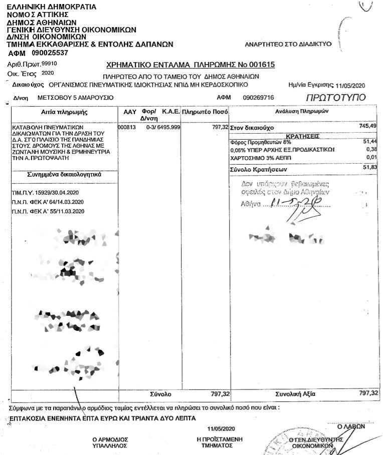 Το ένταλμα πληρωμής υπογράφεται από τις αρμόδιες υπηρεσίες του δήμου Αθηναίων και το ποσό πιστώθηκε στον λογαριασμό του Οργανισμού Πνευματικής Ιδιοκτησίας (ΟΠΙ) και όχι στον ίδιο τον μουσικοσυνθέτη. Ίσως για αυτό τον λόγο ο κ. Κραουνάκης είπε ότι δεν πληρώθηκε καθώς το ένταλμα πληρωμής δεν πήγε σε αυτόν!