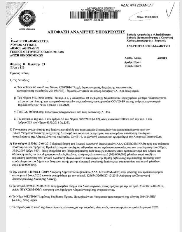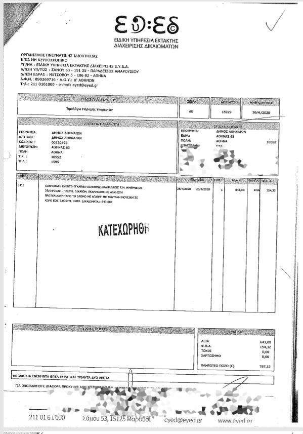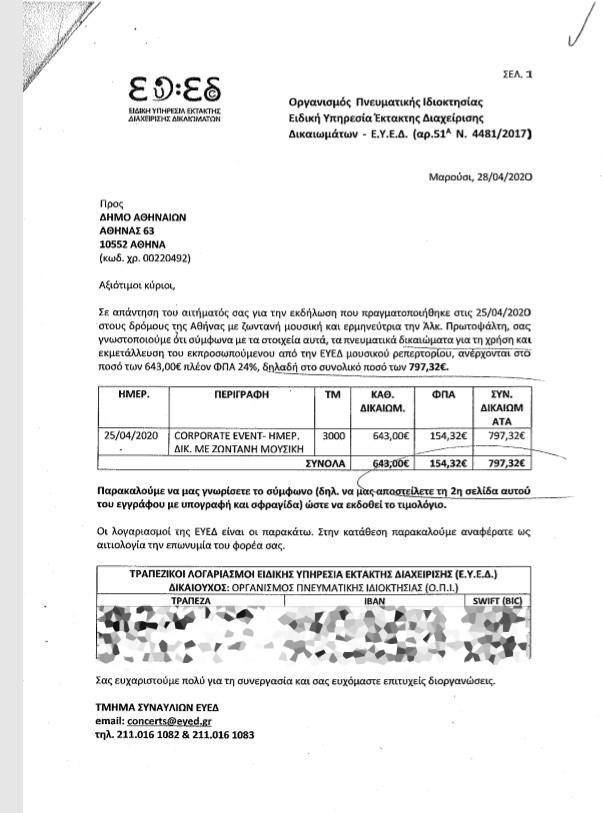 Σύμφωνα με τα σχετικά παραστατικά, ο δήμος Αθηναίων ενέκρινε το ποσό των 794,32 ευρώ στις 30 Απριλίου, την επομένη του εξωδίκου του Σταμάτη Κραουνάκη, ο οποίος κατήγγειλε πως ακούστηκαν δικά του τραγούδια χωρίς την άδειά του.