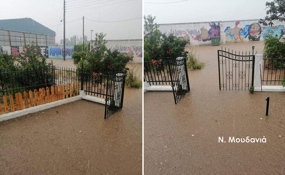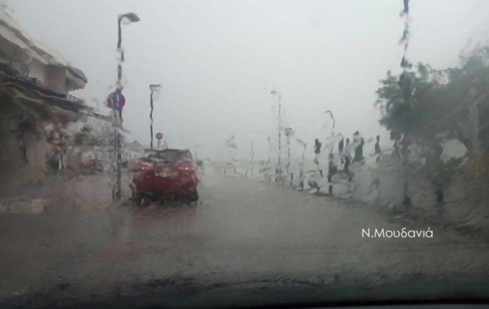 Στα Νέα Μουδανιά η σφοδρότητα της βροχής ήταν τόσο έντονη, που οι δρόμοι μετατράπηκαν σε ποτάμια και για αρκετή ώρα η κυκλοφορία μέσα στην πόλη διεξαγόταν με δυσκολία.