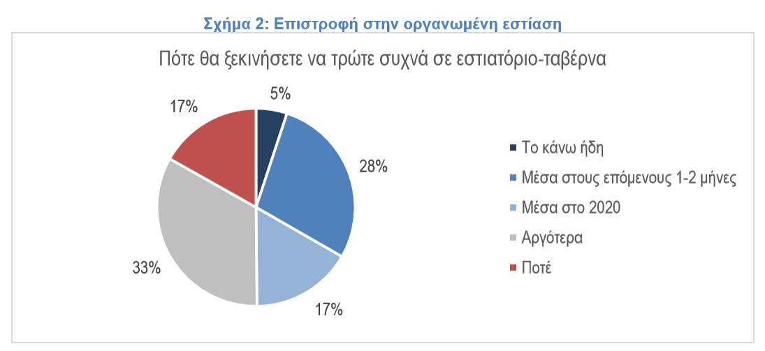 ¬Όσον αφορά την αγορά της εστίασης που ξεκινάει τη λειτουργία της στις 25 Μαϊου, το 33% ή 1 στους 3 θα ξεκινήσει άμεσα την συνήθεια του φαγητού σε εστιατόριο-ταβέρνα, ενώ 17% αργότερα μέσα στον χρόνο. 1 στους 2 όμως δεν θα επιστρέψει στην οργανωμένη εστίαση μέσα στο 2020.