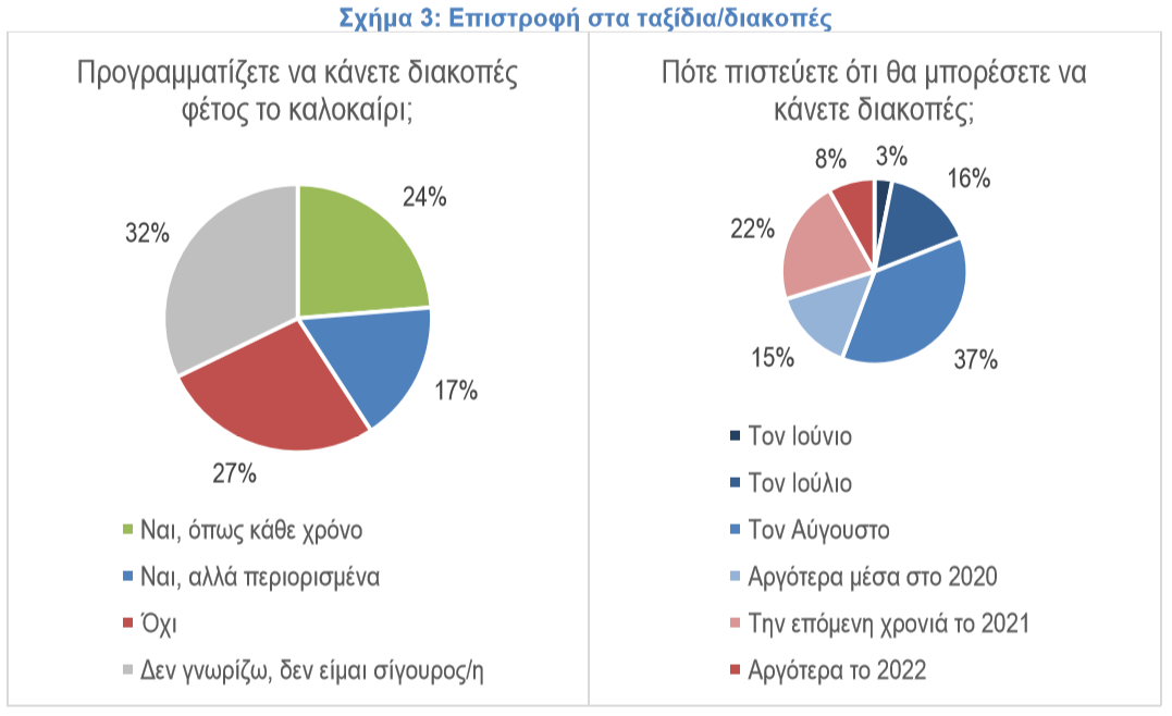 Η πλειοψηφία σε ποσοστό 37% εκτιμά ότι θα έχει τη δυνατότητα να κάνει διακοπές τον Αύγουστο, το 16% νωρίτερα από τον Ιούλιο και το 15% αργότερα μετά το καλοκαίρι μέσα στο 2020. Το 30% θεωρεί ότι δεν θα μπορέσει φέτος να κάνει διακοπές, ενώ ένα 8% θεωρεί ότι δεν μπορέσει κάνει διακοπές ούτε το 2021.