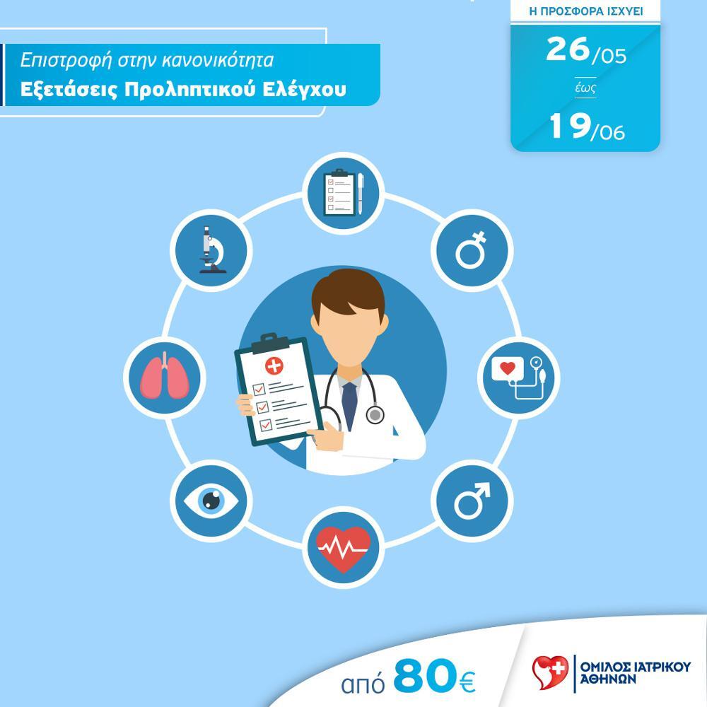 Συγκεκριμένα, οι προσφορές εξετάσεων προληπτικού ελέγχου ισχύουν για το χρονικό διάστημα από 26/05/2020 έως και 19/06/2020 και περιλαμβάνουν τα εξής:
