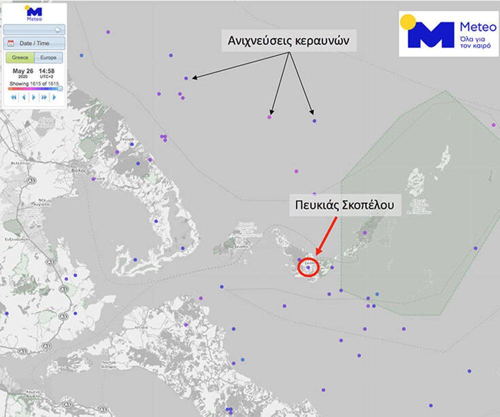 Σημειώνεται ότι το σύστημα ανίχνευσης κεραυνών «ZEUS» του Εθνικού Αστεροσκοπείου Αθηνών/meteo.gr κατέγραψε τον κεραυνό, ο οποίος σήμερα το πρωί χτύπησε μία 52χρονη γυναίκα στον Πευκιά Σκοπέλου, την ώρα που εκτελούσε αγροτικές εργασίες και βρήκε ακαριαίο θάνατο.
