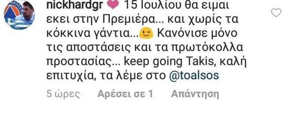 Ο Νίκος Χαρδαλιάς, που υπήρξε ένα από τα πιο πολυσυζητημένα πρόσωπα της περιόδου του κορωνοϊού στη χώρα μας, σχολίασε την ανάρτηση του Τάκη Ζαχαράτου με αυτοσαρκασμό, γράφοντας, μάλιστα, πως δεσμεύεται να πάει να παρακολουθήσει την παράστασή του στο “Άλσος”.