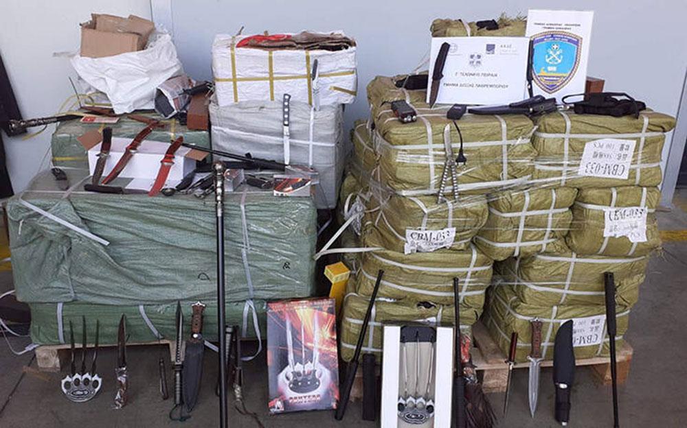 Συγκεκριμένα εντοπίστηκαν δεκαεπτά χαρτοκιβώτια με χίλια εκατόν εξήντα δύο τεμάχια μαχαίρια,έξι χαρτοκιβώτια με εξακόσια ενενήντα δύο τεμάχια «TEASER GUNS», τρία χαρτοκιβώτια με εβδομήντα τρία τεμάχια μπαστούνια -ξίφη, δέκα τεμάχια σιδερογροθιές με λάμες και τριάντα χαρτοκιβώτια με τρεις χιλιάδες τεμάχια γκλομπς.